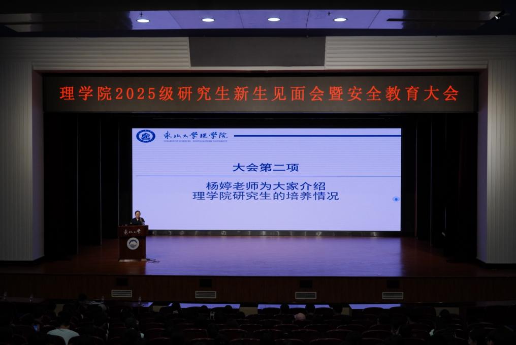 9月4日,学院在汉卿会堂举行2025级研究生新生见面会暨安全教育大会,将新生教育工作推向深入。理学院副院长杨婷,党委副书记、副院长【兼】马犇,教学科研办公室主任李博,研究生辅导员魏嵩宸和理学院学生工作办公室副主任何瑞擎出席会议。全体2025级研究生参加会议。