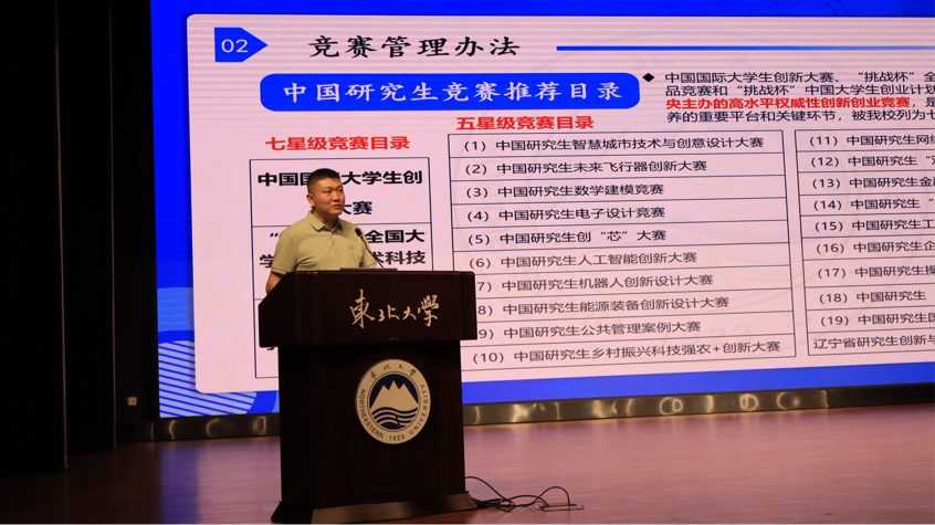 为进一步激发参与热情,逄锐展示了东北大学近年在各类创新创业竞赛中的亮眼成果,并强调研究生在科研竞赛中的中坚作用。